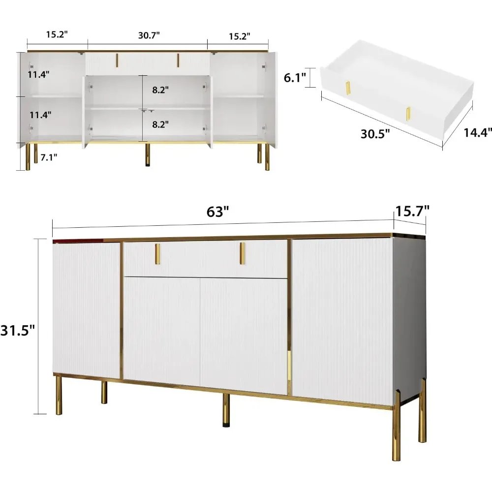 The Modern Sideboard with Drawers and Pop-up Doors is the perfect blend of style and utility. Crafted with exquisite detailing and a sleek silhouette, this sideboard elevates the aesthetic of any living room or hallway. The gold metal legs provide a luxurious touch while ensuring sturdy support, making this piece ideal for both daily use and special occasions.